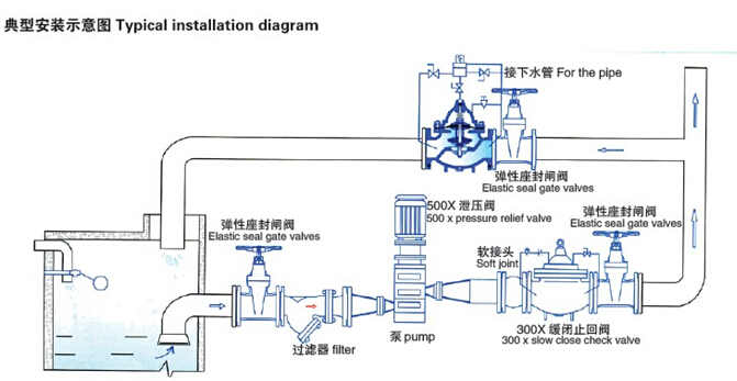 由主閥、泄壓/持壓導閥針閥、球閥、微形過濾器和壓力表組成水力控制接管系統(tǒng)。利用水力自動操作,即可以作泄壓閥用又可作持壓閥用。作泄壓閥用時,可維持供水路壓力在設(shè)定的安全值之下;做持壓閥用,可維持主閥上游水壓在設(shè)定值之上,保持主閥上游供水壓力。